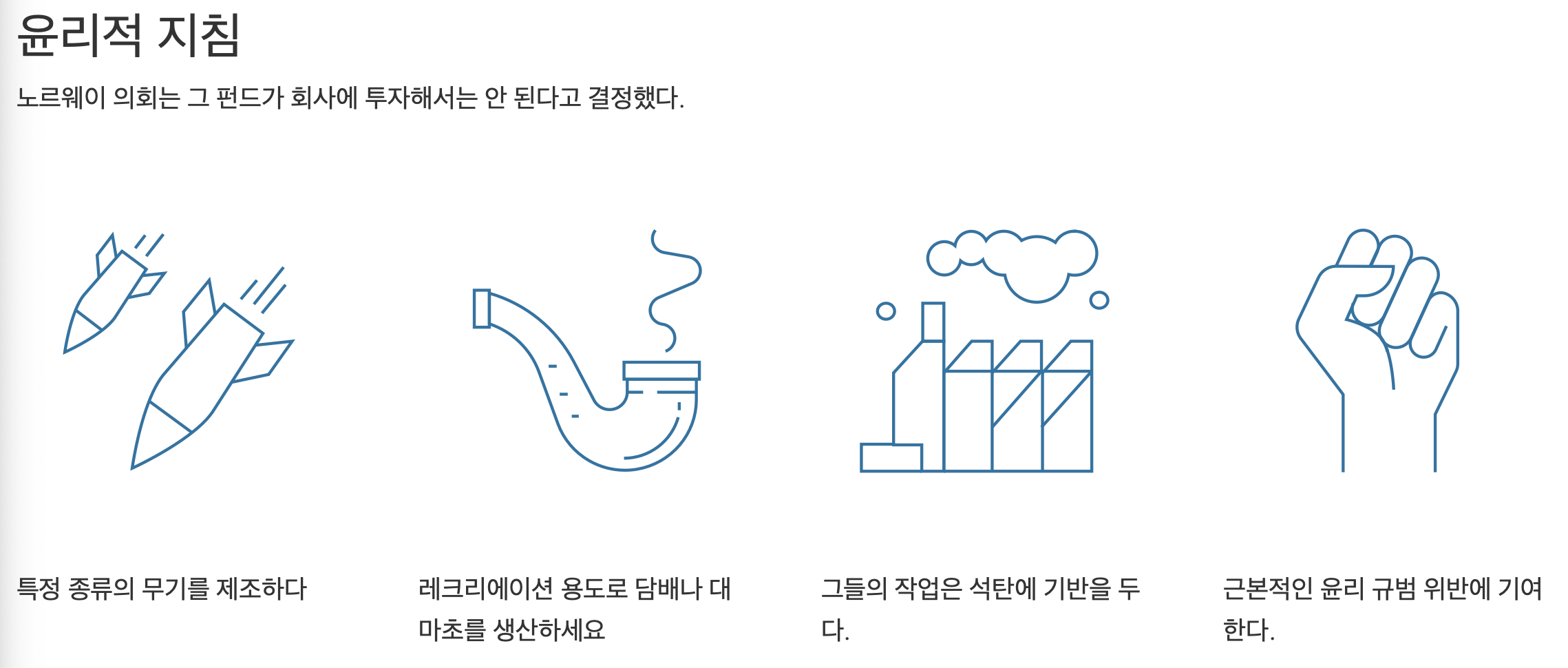 환경피해나 인권침해, 담배 생산 또는 무기 생산과 관련된 한국 기업들이 심심찮게 보이고 있었습니다. 책의 말미에도 나오는 내용이지만 이러한 행동(책임투자)을 통해 그들이 이러한 기업에 대해 최소한의 영향을 미치려 합니다. 기업의 장기적 가치 창출과 환경과 사회에 미치는 부정적인 영향을 최소화하기 위함이라고 합니다.